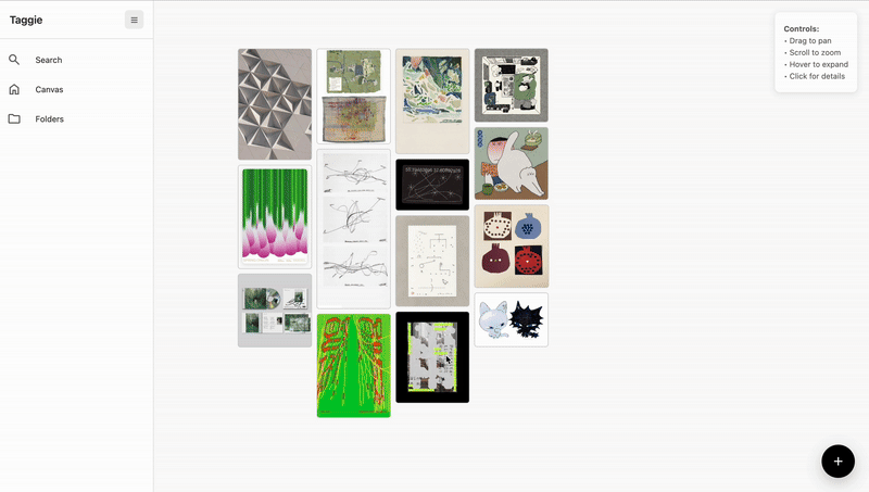 On the homepage, users can zoom in and out to see their full collection. Hovering over and clicking on the image allows users to see tags attached at a glance.